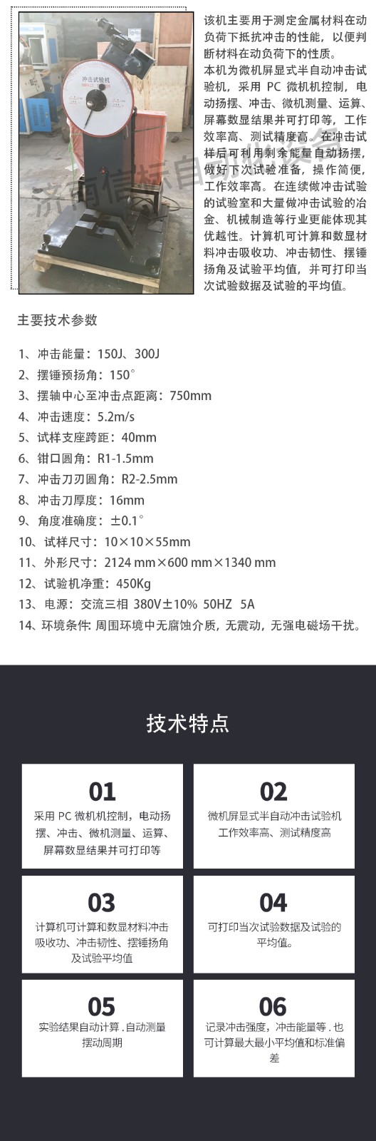 按照 GB/T3808-2018 (擺錘式?jīng)_擊試驗(yàn)機(jī)的檢驗(yàn))及 ISO148-2(金屬材料擺錘式夏比沖擊試驗(yàn)第二部分,試驗(yàn)機(jī)檢定)、ASTM E23 相關(guān)標(biāo)準(zhǔn)生產(chǎn)制造符合 GB/T229-2020(金屬夏比缺口沖擊試驗(yàn)方法)、ISO148 (金屬材料擺錘式夏比沖擊試驗(yàn))、JJG 145-2007 (擺錘式?jīng)_擊試驗(yàn)機(jī)檢定規(guī)程) 四、主要技術(shù)指標(biāo): 1、沖擊能量:150J、300J 2、擺錘預(yù)揚(yáng)角:150° 3、擺軸中心至沖擊點(diǎn)距離:750mm 4、沖擊速度:5.2m/s 5、試樣支座跨距:40mm 6、鉗口圓角:R1-1.5mm 7、沖擊刀刃圓角:R2-2.5mm 8、沖擊刀厚度:16mm 9、角度準(zhǔn)確度:±0.1° 10、試樣尺寸:10×10×55mm 11、外形尺寸:2124 mm×600 mm×1340 mm 12、試驗(yàn)機(jī)凈重:450Kg 13、電源:交流三相 380V±10% 50HZ 5A 14、環(huán)境條件:周圍環(huán)境中無腐蝕介質(zhì),無震動(dòng),無強(qiáng)電磁場干擾。 五、設(shè)備主要配置: 1、300焦耳主機(jī)一臺(tái); 2、150J、300J 擺錘各一個(gè) 3、取擺傳動(dòng)裝置一套(裝在主機(jī)上) 4、自動(dòng)掛擺裝置一套(裝在主機(jī)上) 5、保險(xiǎn)機(jī)構(gòu)一套(裝在主機(jī)上) 6、安全防護(hù)裝置一套 7、擺錘拆卸器一只 8、支座調(diào)校器一只 9、試樣對(duì)中器一只 10、聯(lián)想打印機(jī)一套 11、專用測量軟件一套 測控部分說明: Windows 平臺(tái), 屏顯,鼠標(biāo)操作(操作窗口如下); 如果需要輸出實(shí)驗(yàn)報(bào)告,需要安裝Microsoft Word或Excel版本至少為Office2003。 軟件支持多個(gè)擺錘. 記錄沖擊強(qiáng)度,沖擊能量等.也可計(jì)算最大最小平均值和標(biāo)準(zhǔn)偏差。 實(shí)驗(yàn)結(jié)果自動(dòng)計(jì)算. 自動(dòng)測量擺動(dòng)周期 實(shí)驗(yàn)結(jié)果可根據(jù)客戶使用要求,提供通訊協(xié)議,滿足數(shù)據(jù)上傳,實(shí)現(xiàn)第三方遠(yuǎn)程監(jiān)控