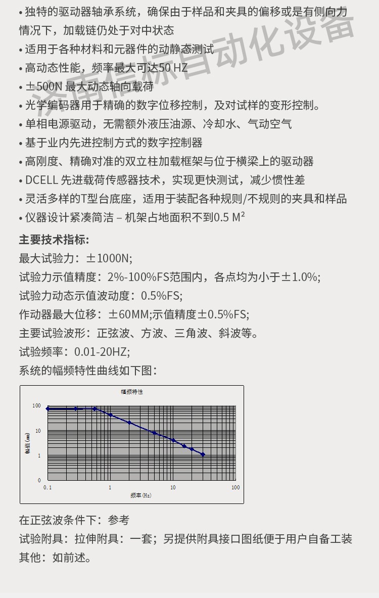 優(yōu)勢特點: ?無需油源的直線電機技術(shù),保證潔凈的測試環(huán)境 ? 軸向通道采用Can總線式控制方式 ? 高速直線作動器 ? 獨特的驅(qū)動器軸承系統(tǒng),確保由于樣品和夾具的偏移或是有側(cè)向力情況下,加載鏈仍處于對中狀態(tài) ? 適用于各種材料和元器件的動靜態(tài)測試 ? 高動態(tài)性能,頻率最大可達50 Hz ? ±500N 最大動態(tài)軸向載荷 ? 光學(xué)編碼器用于精確的數(shù)字位移控制,及對試樣的變形控制。 ? 單相電源驅(qū)動,無需額外液壓油源、冷卻水、氣動空氣 ? 基于業(yè)內(nèi)先進控制方式的數(shù)字控制器 ? 高剛度、精確對準的雙立柱加載框架與位于橫梁上的驅(qū)動器 ? Dcell 先進載荷傳感器技術(shù),實現(xiàn)更快測試,減少慣性差 ? 靈活多樣的T型臺底座,適用于裝配各種規(guī)則/不規(guī)則的夾具和樣品 ? 儀器設(shè)計緊湊簡潔 – 機架占地面積不到0.5 m2 優(yōu)勢特點: ?無需油源的直線電機技術(shù),保證潔凈的測試環(huán)境 ? 軸向通道采用Can總線式控制方式 ? 高速直線作動器 ? 獨特的驅(qū)動器軸承系統(tǒng),確保由于樣品和夾具的偏移或是有側(cè)向力情況下,加載鏈仍處于對中狀態(tài) ? 適用于各種材料和元器件的動靜態(tài)測試 ? 高動態(tài)性能,頻率最大可達50 Hz ? ±500N 最大動態(tài)軸向載荷 ? 光學(xué)編碼器用于精確的數(shù)字位移控制,及對試樣的變形控制。 ? 單相電源驅(qū)動,無需額外液壓油源、冷卻水、氣動空氣 ? 基于業(yè)內(nèi)先進控制方式的數(shù)字控制器 ? 高剛度、精確對準的雙立柱加載框架與位于橫梁上的驅(qū)動器 ? Dcell 先進載荷傳感器技術(shù),實現(xiàn)更快測試,減少慣性差 ? 靈活多樣的T型臺底座,適用于裝配各種規(guī)則/不規(guī)則的夾具和樣品 ? 儀器設(shè)計緊湊簡潔 – 機架占地面積不到0.5 m2