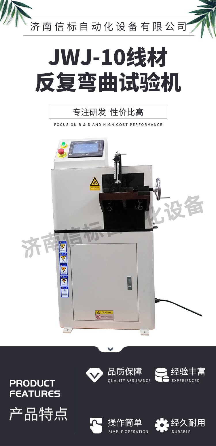 主要技術參數 1.試樣直徑:Φ0.3-Φ10mm 2.試樣長度:150-250mm 3.彎曲角度:±90°(平面彎曲) 4.計數范圍:99999 5.顯示方式:液晶顯示,自動記錄次數 6.彎曲速度:≤60rpm 7.電機功率:1.5kw 8.電 源:220V,50Hz 9.外形尺寸:740*628*1120mm 10.主機重量:約200 kg 結構特征與工作原理 本試驗機主要由主機和電器測控系統兩大部分組成,采用機械傳動,施加試驗力矩使試樣反復彎曲,利用光電開關來檢測彎曲試驗次數。試樣斷裂后自動停機,擺桿復位,液晶表自動顯示,記錄彎曲試驗次數。 主機 主機由電機,通過皮帶輪帶動蝸桿蝸輪副減速,再由曲柄—擺桿機構,帶動圓柱齒輪傳動,圓柱齒輪帶動擺桿做±90°回轉,從而使擺桿上的導套帶動試樣做±90°的彎曲,達到試驗的目的。在圓柱齒輪上裝有記數用的裝置,試樣每彎曲一次,光電開關采集一次信號,這樣就達到了記數的目的。 試驗結束后,如果擺桿沒有停到中間位置,按復位鍵,則由另一只光電開關采集信號,使擺桿恢復到中間位置。 在擺桿上,裝有撥桿,而撥桿上裝有內徑大小不同的導套,針對不同粗細的試樣,把撥桿調整到不同的高度,并使用不同的導套。將導套放入撥桿孔內,用扭簧將其別住,并使其與撥桿導通。 在擺桿的下方,裝有試樣夾持裝置。手動旋轉絲杠,使活動鉗口平移,將試樣夾緊。對不同直徑的試樣,更換相應的鉗口和導套(鉗口和導套上有標記)。