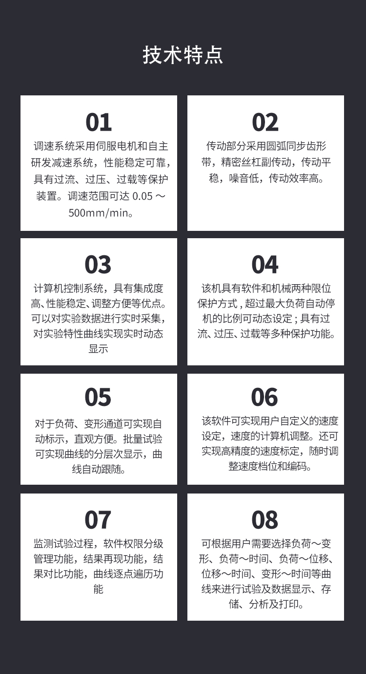 該機采用調(diào)速精度高、性能穩(wěn)定的全數(shù)字伺服調(diào)速系統(tǒng)及步進電機作為驅(qū)動系統(tǒng),控制器作為控制系統(tǒng)核心,以WINDOWS為操作界面的控制與數(shù)據(jù)處理軟件,實現(xiàn)試驗力、試驗力峰值、橫梁位移、試驗變形及試驗曲線的屏幕顯示,所有試驗操作均可以通過鼠標在計算機上自動完成。良好的人性化設計使試驗操作更為簡便。綜合以上各項技術,該機可以近乎完美的實現(xiàn)試驗力、變形及位移等參數(shù)的閉環(huán)控制,可實現(xiàn)恒應力、恒應變、恒位移等控制模式,并且各種控制模式之間可以平滑切換。該機完全滿足國家標準GB/T228-2002《金屬材料室溫拉伸試驗方法》的要求,同 時可根據(jù)GB、ISO、JIS、ASTM、DIN及用戶提供多種標準進行試驗和數(shù)據(jù)處理,并且具有良好的擴展性。