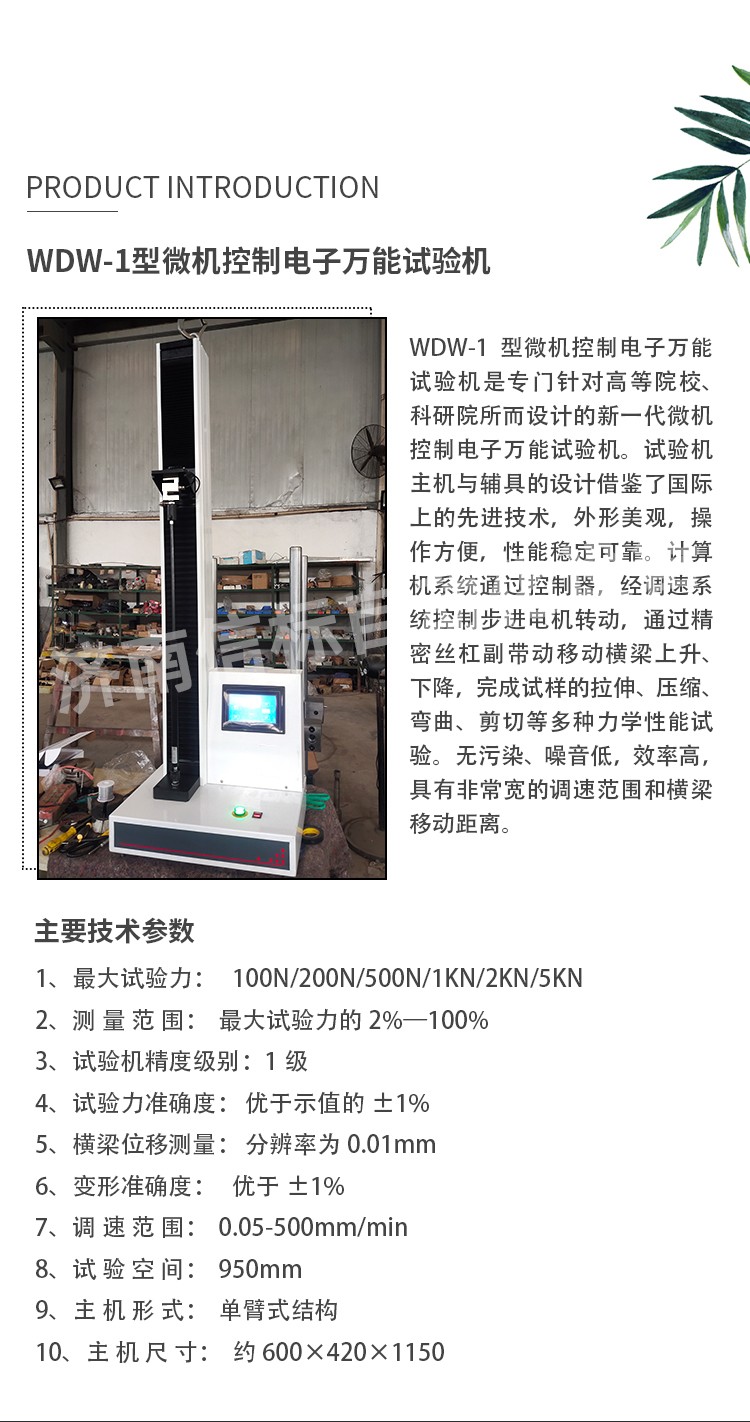 二、主要技術指標: 1、最大試驗力: 100N/200N/500N/1KN/2KN/5KN 2、測 量 范 圍: 最大試驗力的2%—100% 3、試驗機精度級別:1級 4、試驗力準確度: 優(yōu)于示值的±1% 5、橫梁位移測量: 分辨率為0.01mm 6、變形準確度: 優(yōu)于±1% 7、調(diào) 速 范 圍: 0.05-500mm/min 8、試 驗 空 間: 950mm 9、主 機 形 式: 單臂式結(jié)構 10、主 機 尺 寸: 約600×420×1150 11、重 量: 約90Kg 12、工 作 環(huán) 境: 室溫~45℃,濕度20%~80%