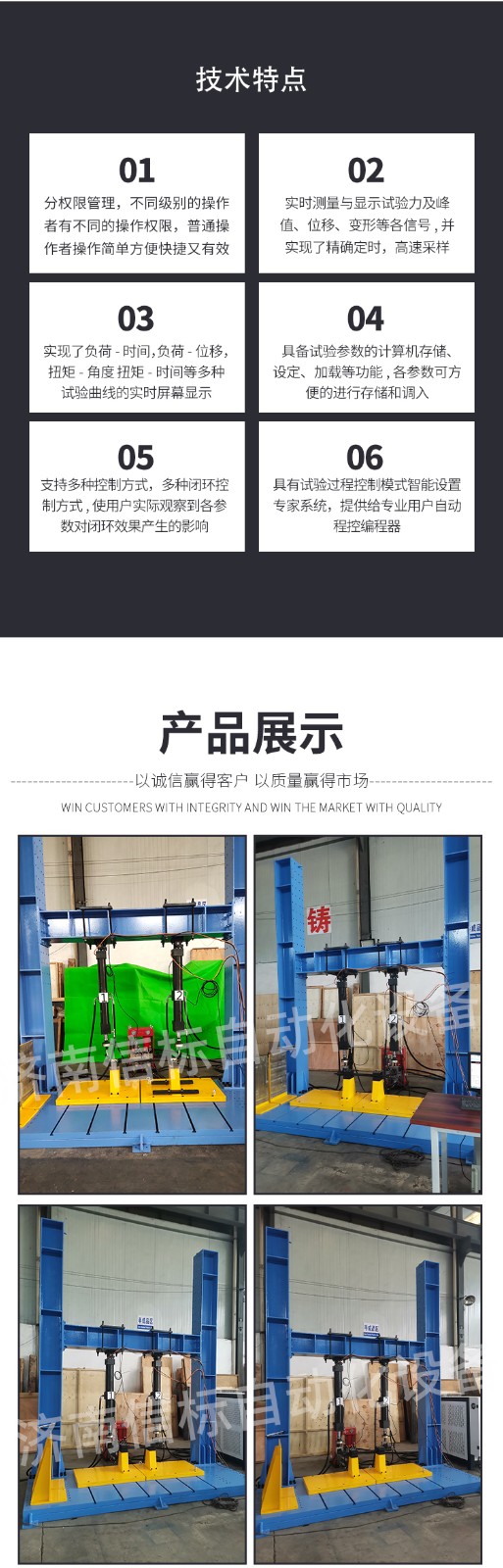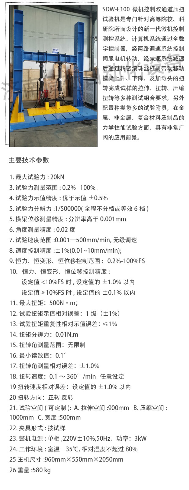主要技術(shù)指標(biāo): 1. 最大試驗(yàn)力: 20kN 3. 試驗(yàn)力測(cè)量范圍: 0.2%--100%。 4. 試驗(yàn)力示值精度:優(yōu)于示值±0.5% 5. 試驗(yàn)力分辨力:1/500000(全程不分檔或等效6檔) 5. 橫梁位移測(cè)量精度:分辨率高于0.001mm 6. 角度測(cè)量精度: 0.02度 7. 試驗(yàn)速度范圍:0.001—500mm/min,無級(jí)調(diào)速 8. 速度控制精度:±1%(0.01~10mm/min); 9. 恒力、恒變形、恒位移控制范圍: 0.2%-100%FS 10.恒力、恒變形、恒位移控制精度: 設(shè)定值<10%FS時(shí),設(shè)定值的±1.0%以內(nèi) 設(shè)定值≥10%FS時(shí),設(shè)定值的±0.1%以內(nèi) 11.最大扭矩:500N·m; 12.試驗(yàn)扭矩示值相對(duì)誤差:1級(jí)(±1%) 13.試驗(yàn)扭矩重復(fù)性相對(duì)示值誤差:≤1% 14.扭矩分辨力:0.01N.m 15.扭轉(zhuǎn)角測(cè)量范圍:無限制 16.最小讀數(shù)值:0.1° 17.扭轉(zhuǎn)角測(cè)量相對(duì)誤差:±1.0% 18.扭轉(zhuǎn)速度:0.1~360°/min 任意設(shè)定 19.扭轉(zhuǎn)速度相對(duì)誤差:設(shè)定值的±1.0%以內(nèi) 20.扭轉(zhuǎn)方向:正轉(zhuǎn) 反轉(zhuǎn) 21. 試驗(yàn)空間(可定制): A.拉伸空間:900mm B.壓縮空間:1000mm C.寬度:500mm 22. 夾具形式: 按試樣 23. 整機(jī)電源:單相,220V±10%,50Hz,功率:3kW 24. 工作環(huán)境:室溫—35℃,相對(duì)濕度不超過80% 25 主機(jī)尺寸:960mm×550mm×2050mm 26 重量:580 kg 主機(jī) 1.1主機(jī)采用高鋼度框架結(jié)構(gòu),強(qiáng)度高、變形小; 1.2 采用進(jìn)口高精度滾珠絲杠,傳動(dòng)高效平穩(wěn); 1.3 傳動(dòng)部分采用圓弧齒同步帶傳動(dòng),傳動(dòng)過程中雙向無間隙; 1.4 采用交流伺服電機(jī)及驅(qū)動(dòng)系統(tǒng),確保傳動(dòng)平穩(wěn),力矩穩(wěn)定,具有過流、過壓、過載等保護(hù)裝置,調(diào)速比可達(dá)1:100000; 1.5 夾具經(jīng)特殊設(shè)計(jì),夾持牢固,操作方便,無鉗口滑移現(xiàn)象; 1.6 特殊工藝保證試驗(yàn)機(jī)同軸度,很好的消除了不規(guī)則試樣對(duì)傳感器的影響。 1.7NMRV高精度減速機(jī),零背隙保證正反轉(zhuǎn)沒有間隙 1.8防耦合反力架,保證壓縮和扭轉(zhuǎn)時(shí)兩路傳感器互不影響。